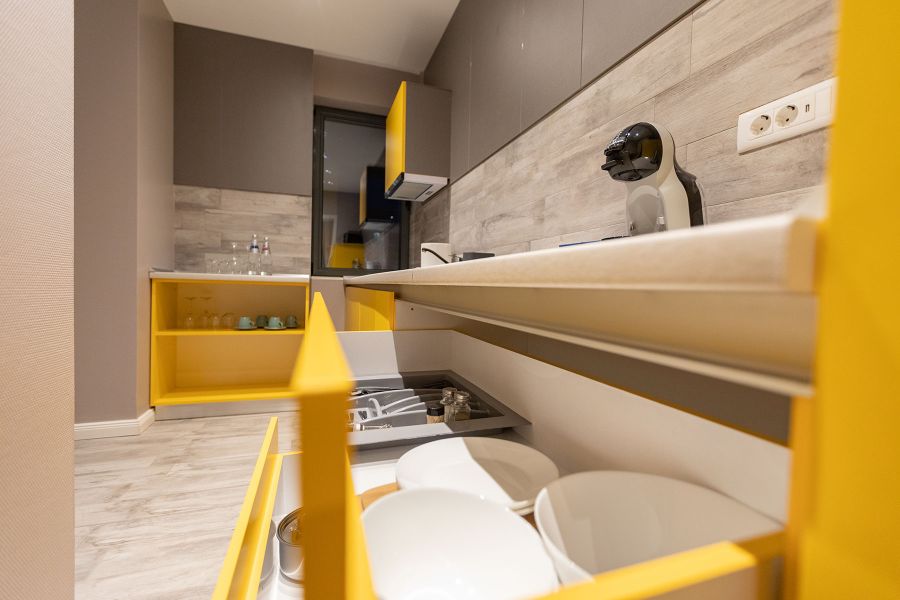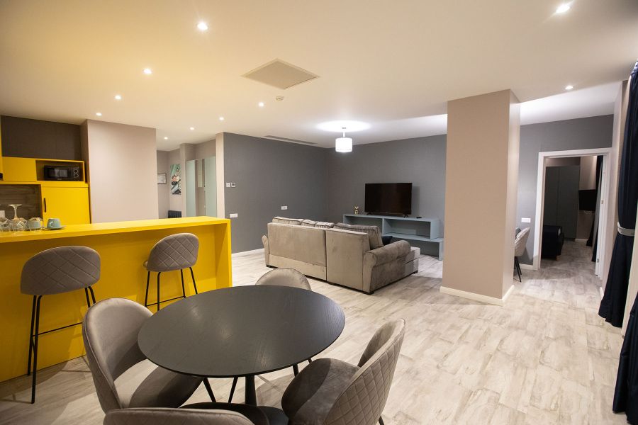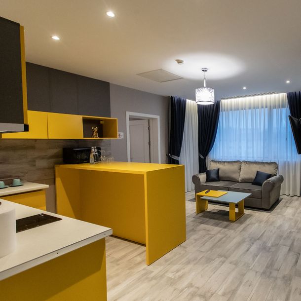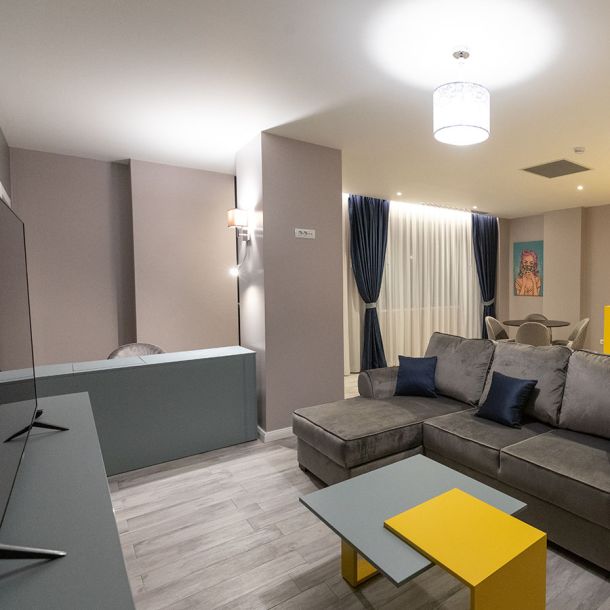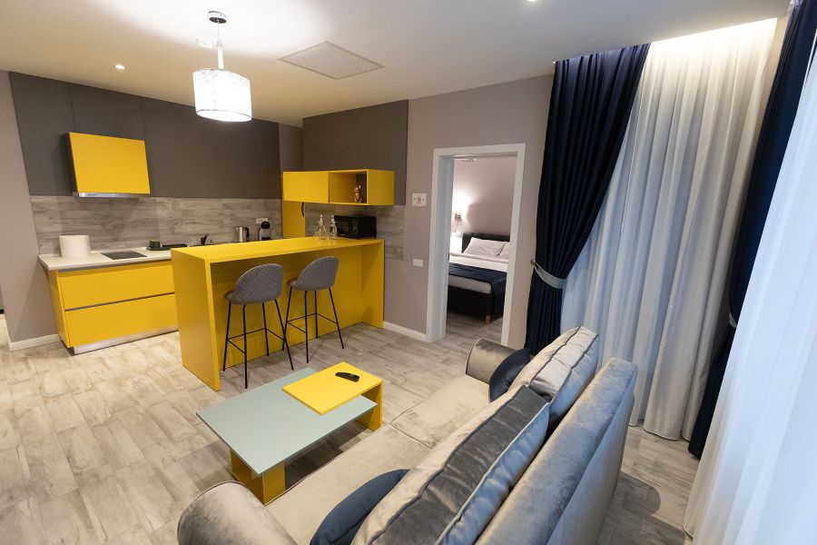 Apartamentul superior dispune de un living extra spatios, o zona de dining si un birou, ceea ce il face o alegere excelenta pentru cei care se afla in calatorii de afaceri.