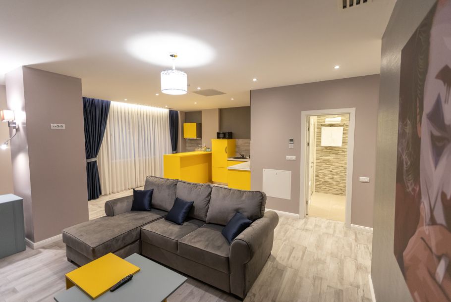 Dormitorul este mare si confortabil si ofera un spatiu amplu de depozitare. Tavanele inalte si ferestrele mari ofera un sentiment de deschidere, facandu-l locul perfect pentru odihna. Livingul este dotat cu o canapea extensibila ideala pentru a gazdui pana la 4 persoane.