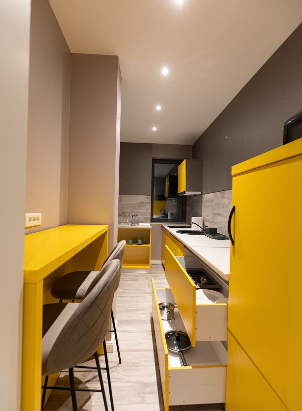 Apartamentul este o unitate frumos proiectata, care are o zona de living foarte spatioasa, ideala pentru oaspeti, cu o zona de dinning si bucatarie mare open space. Bucataria este complet utilata, ceea ce o face locul perfect pentru a gati si a distra oaspetii.